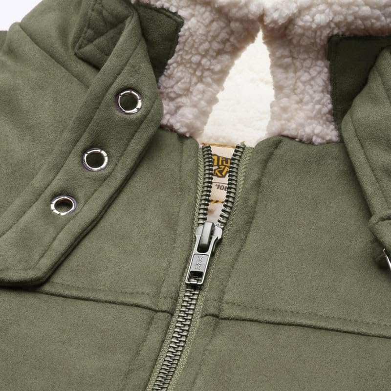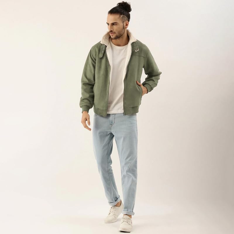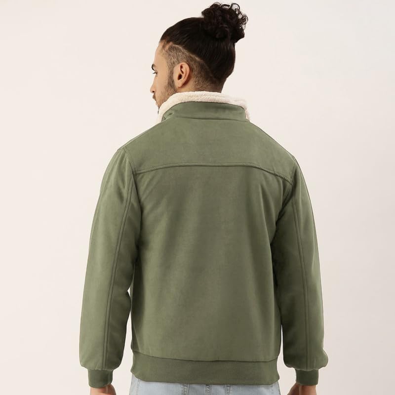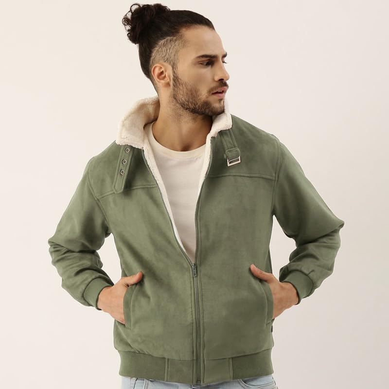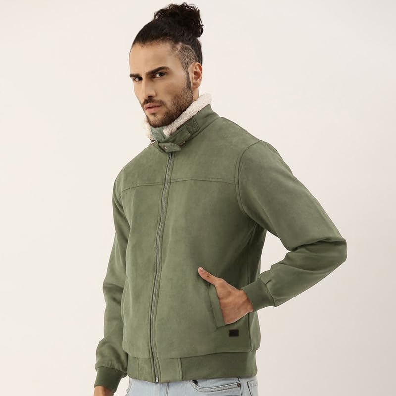 HomeMen's JacketsCampus Sutra Men’s Obsidian Green Fur-Lined Suede Bomber Jacket For Casual Wear | High Neck | Long Sleeve | Zipper Closure | Jacket Crafted With Comfort Wear For Everyday Wear