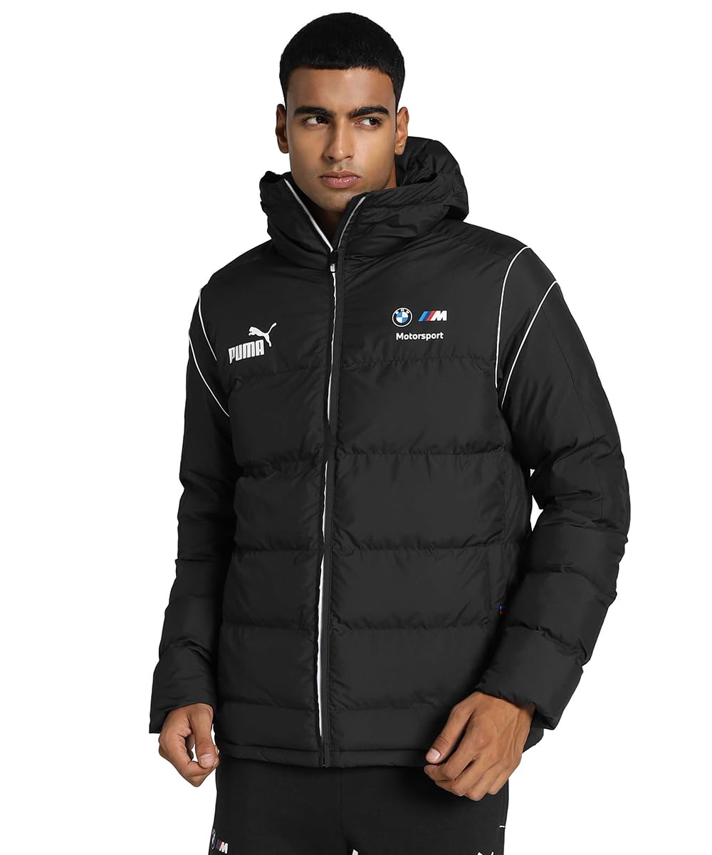 PRODUCT STORY: Taking inspiration from PUMA’s iconic T7 silhouettes, this MT7 padded jacket has been given a Motorsport edge by the official BMW M Motorsport badge, signature colours and reflective piping on the shoulders. But it’s not just about the looks, it’s also packed with rain protection and temperature control tech so you can stay snug and dry while enjoying the race.FEATURES & BENEFITS rainCELL: Technology designed to keep you protected from the rain and dry during exercise warmCELL: Breathable cold weather technology designed to trap heat close to your body and keep you warm during exercise DETAILS Plain weave fabric Official BMW M Motorsport logo and colours on left chest and pocket Side zip pockets with branded zip pulls Iconic MT7 Body Contrasting full zip and piping Roll neck Elasticated hood Long sleeves Regular fit PUMA Cat logo on right chest